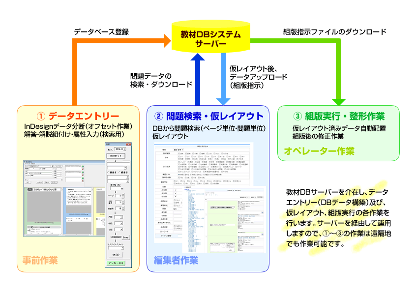 1. InDesignで組版されたデータをスニペット形式にし、検索属性を付加し、DB登録します。 2. 編集者が使えるDBデータのレイアウト機能(仮レイアウト)→InDesignを使用しません。 3. 問題(大問・中問・小問)レイアウトにより、解答・解説を自動配置します。 4. 組版指示ファイル(仮レイアウト情報)に基づく組版実行機能により、スニペットデータをInDesignで自動配置します。 5. 組版実行後、通常のDTPデータと同様に、整形・修正などの作業が行えます。 |